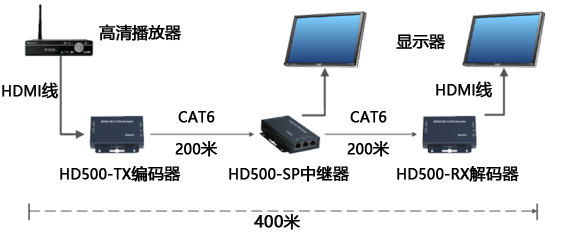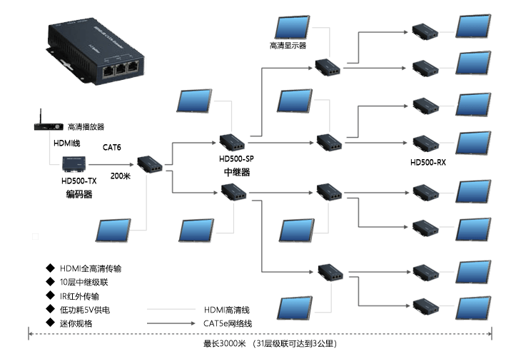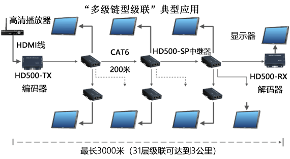 HD500系列產品分別由高清HDMI/DVI音視頻編碼器、中繼器及解碼器組成,應用這套產品可以將全高清1080P(1920*1200)音視頻信號通過網線延長至3000米。產品支持鏈型和樹型架構的高清音視頻傳輸,采用多層級聯能夠連接達百臺顯示終端。 HD500在信息發布上有著廣泛的應用,相對于傳統的信息發布有著無法比擬的優勢。可以實現全部的高清顯示終端的信息內容同步,用于高清實時的直播而且避免的傳統信息發布繁瑣的設置。可以迅速更換大大減小了設備的安裝和維護的成本。